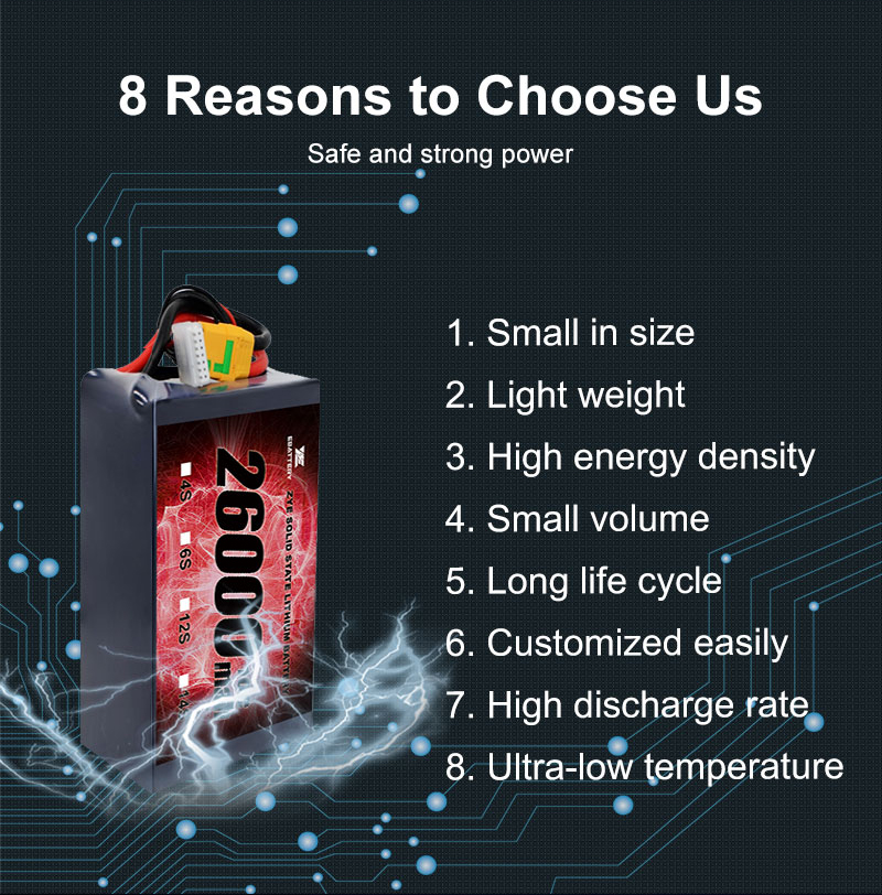 Оваа батерија со цврста состојба е дизајнирана да го револуционизира вашето искуство со беспилотно летало. Со својата голема густина на енергија, можете да постигнете продолжено време на летање и неспоредлива маневрирање. Без разлика дали сте хобист или лидер во индустријата, нашата батерија од 16000mAh е совршен придружник за вашите воздушни авантури.